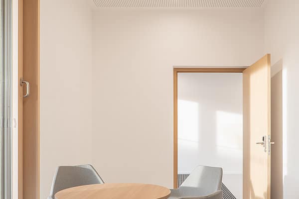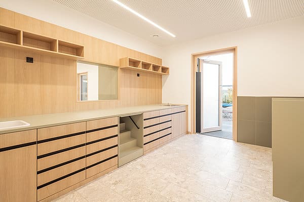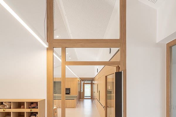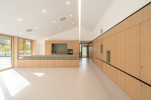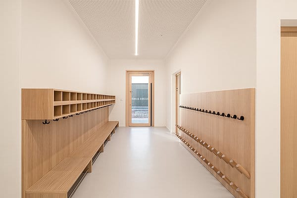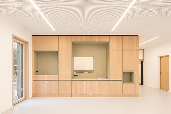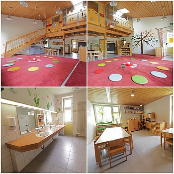 Im Erdgeschoss befindet sich die Regenbogengruppe. Zu dieser Gruppe gehört ein Gruppenraum mit Spielpodest, ein Nebenraum, ein Brotzeitraum, ein Sanitärraum für Kinder und eine Garderobe. Die Räumlichkeiten sind für Kinder über 3 Jahren ausgerichtet.