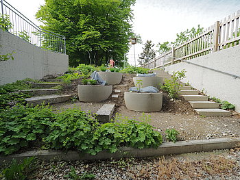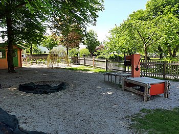 Im schön gestalteten Garten befindet sich ein Sandkasten, eine Schaukel, ein Klettergerüst mit Rutsche und zwei Gartenhäuschen. Zudem für den Sommer ein Wasserspielplatz.